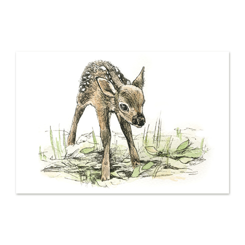 Postkaart Maria Välja illustratsiooni "Siin ma olen! - punahirv (Cervus elaphus)" põhjal, mis on algselt loodud beebiraamatu "Minu esimene raamat" jaoks.