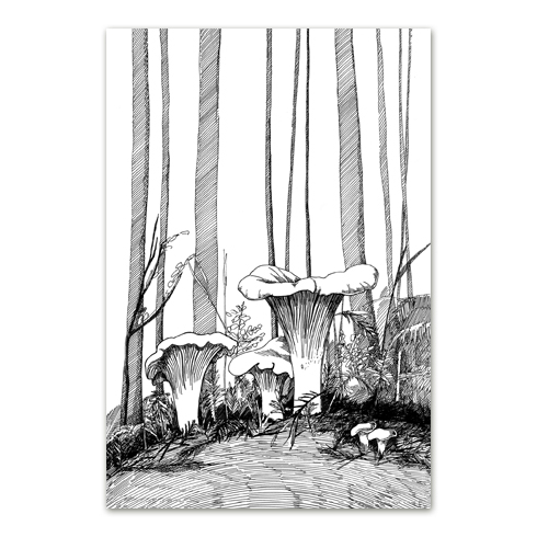 Postkaart Maria Välja kukeseentega tindijoonistuse "Mets on meie kodu" põhjal.