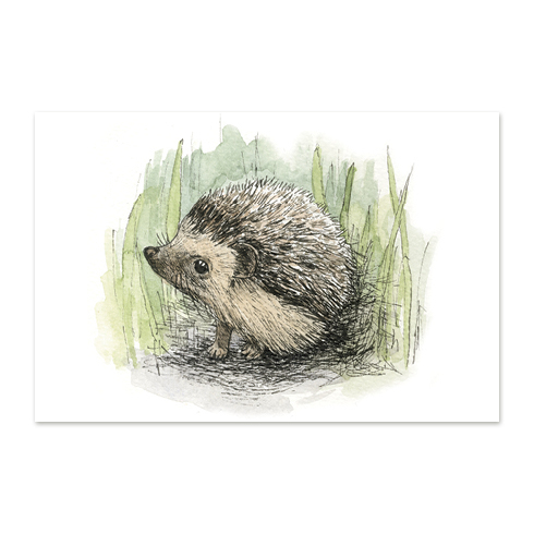 Postkaart Maria Välja illustratsiooni "Harilik siil (Erinaceus europaeus)" põhjal, mis on algselt loodud beebiraamatu "Minu esimene raamat" jaoks.