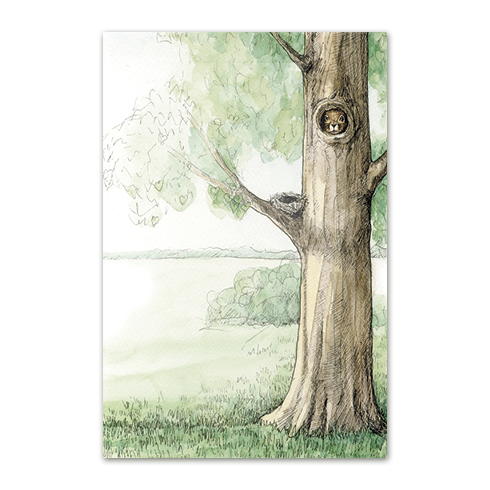 Postkaart Maria Välja illustratsiooni "Kojujõudmine - punaorav (Sciurus vulgaris)" põhjal, mis on algselt loodud beebiraamatu "Minu esimene raamat" jaoks.