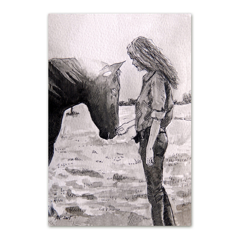 Postkaart Maria Välja illustratsiooniga "Tüdruk hobusega". See sinasõprus hobusega kiirgab soojust nii tüdruku kui ka hobuse poolt. Armas kingitus igale hobusesõbrale!