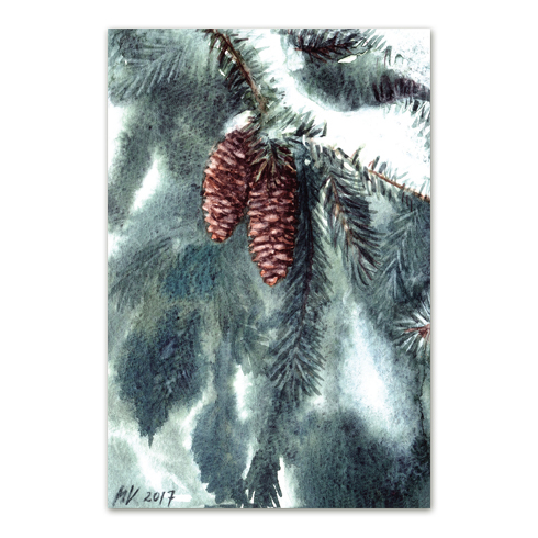 Pühademeeleolus talvekaart Maria Välja akvarellmaaliga "Käbid kuusel". Nostalgiahõnguline jõulukaart.