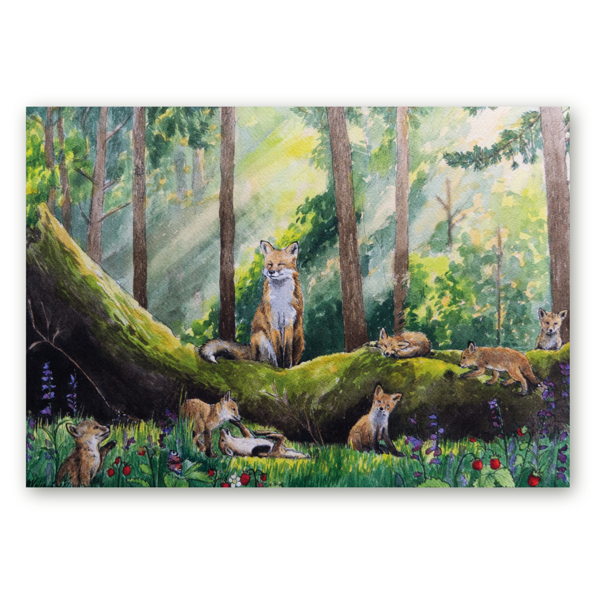 „Rebaseema kutsikatega“ on Maria Välja loodud akvarellmaal, mis kujutab vaikset ja valgust täis metsahetke - ema ja tema mängulisi rebasepoegi rohelisel metsavaibal.