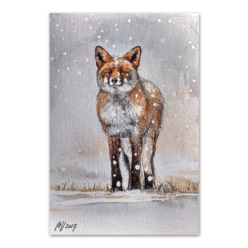 Postkaart Maria Välja akvarellmaaliga "Talvemeeleolu". See lumesajus rebane sobib mõnusaks talviseks tervituseks, aga miks mitte ka muudel aastaaegadel mõnele lume- või rebasesõbrale!