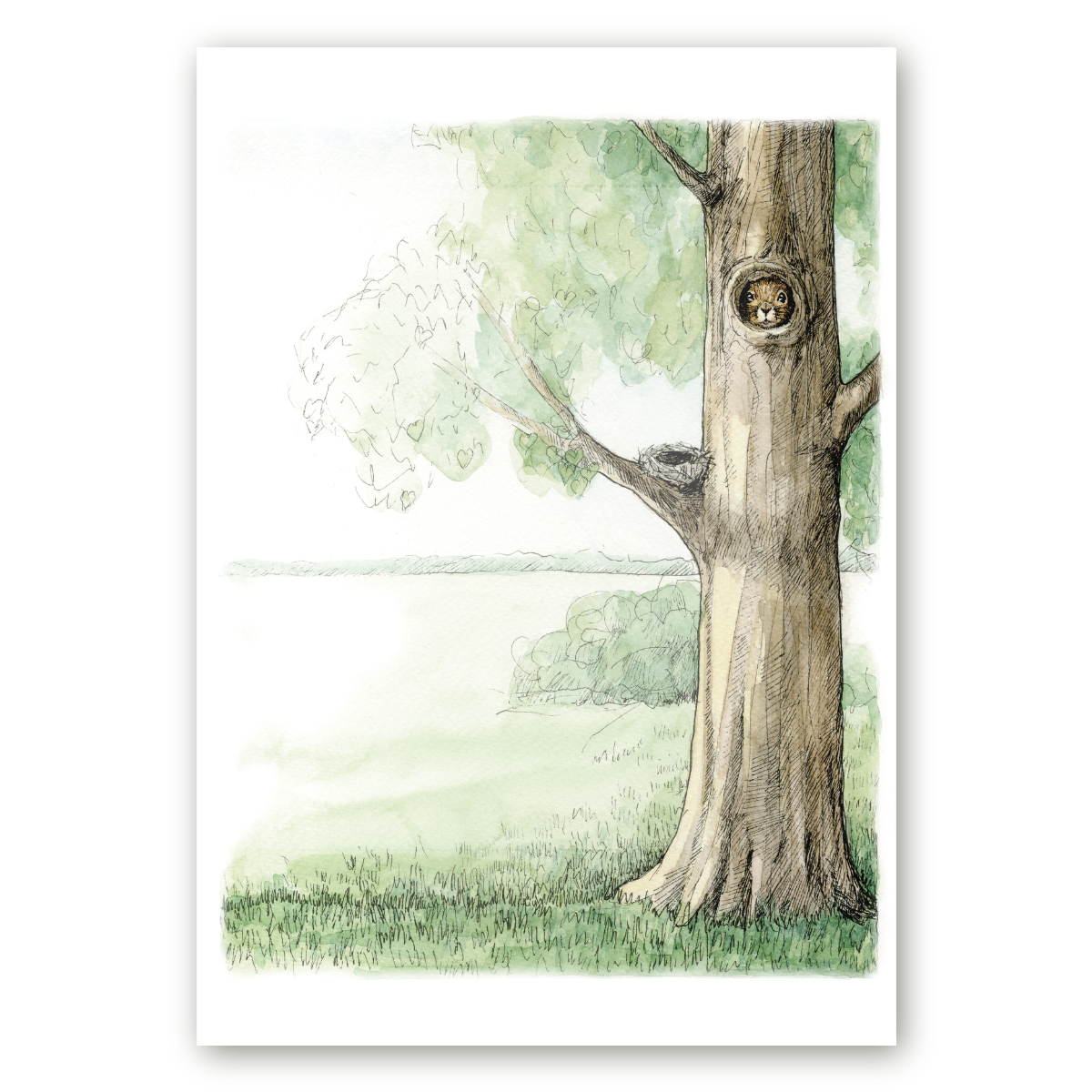 A4 mõõdus poster Maria Välja illustratsiooni "Kojujõudmine - punaorav (Sciurus vulgaris)" põhjal, mis on algselt loodud beebiraamatu "Minu esimene raamat" jaoks.